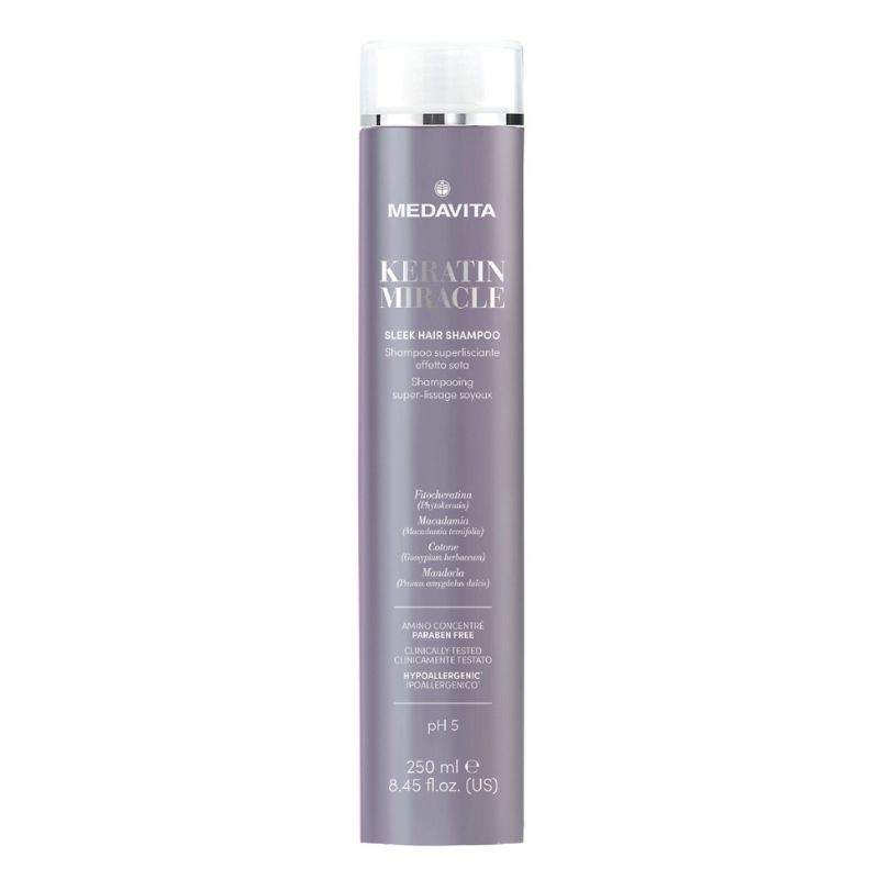 Шампунь Medavita Keratin Miracle Sleek Shampoo м’яко очищає волосся, одночасно розгладжуючи його по ..
