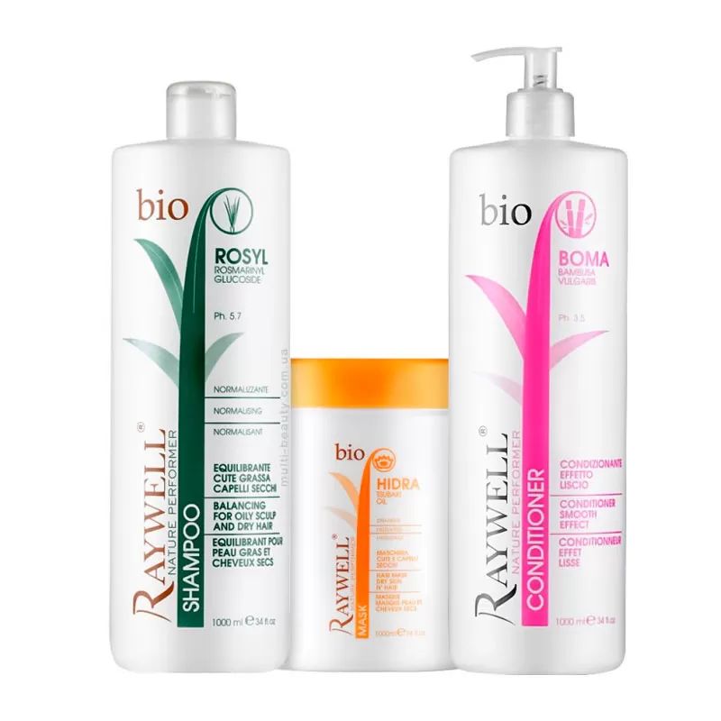 Набір для жирної шкіри голови, зволоження та блиску сухого волосся Raywell Bio шампунь ROSYL, маска Hidra, кондиціонер Boma 3x1000