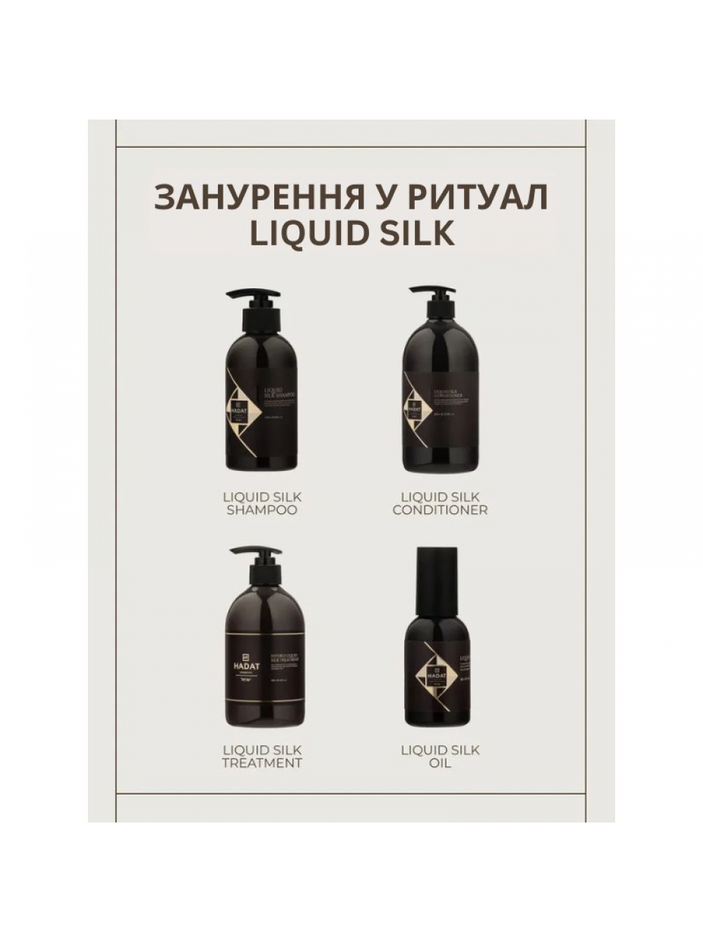 Набір Hadat Liquid Silk TRIO «Рідкий Шовк» — професійний догляд для блиску, гладкості та сили волосся. До складу входять шампунь, кондиціонер і живильна шовкова олія, які комплексно відновлюють волосся, зволожують і захищають від пошкоджень.