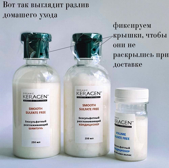 На фото изображен разлив шампуня и кондиционера Organic Keragen в двух размерах: 250 мл и 100 мл. Для масок мы используем соусники в размере 80 и 30 мл.