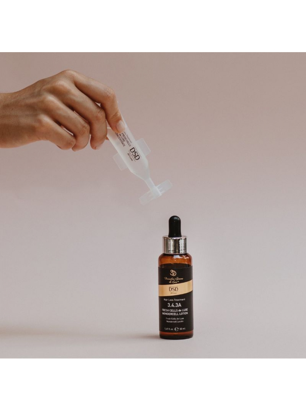 Лосьон DSD De Luxe 3.4.3A Fresh Cells Wondercell Lotion — интенсивное средство для стимуляции роста волос и укрепления волосяных фолликулов. Формула с растительными стволовыми клетками, пептидами и биотином активизирует микроциркуляцию кожи головы, пробуждает «спящие» луковицы и укрепляет корни волос.