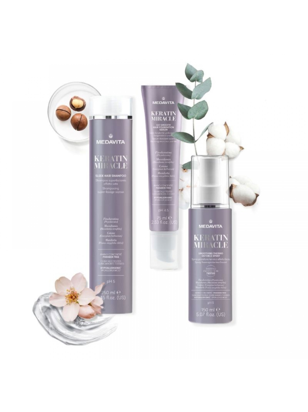 Маска Medavita Keratin Miracle Sleek Hair Mask интенсивно питает и разглаживает волосы, делая их шелковистыми и послушными. Формула с кератином, маслом моринги и аминокислотами укрепляет структуру волос, устраняет пушистость и возвращает естественный блеск.