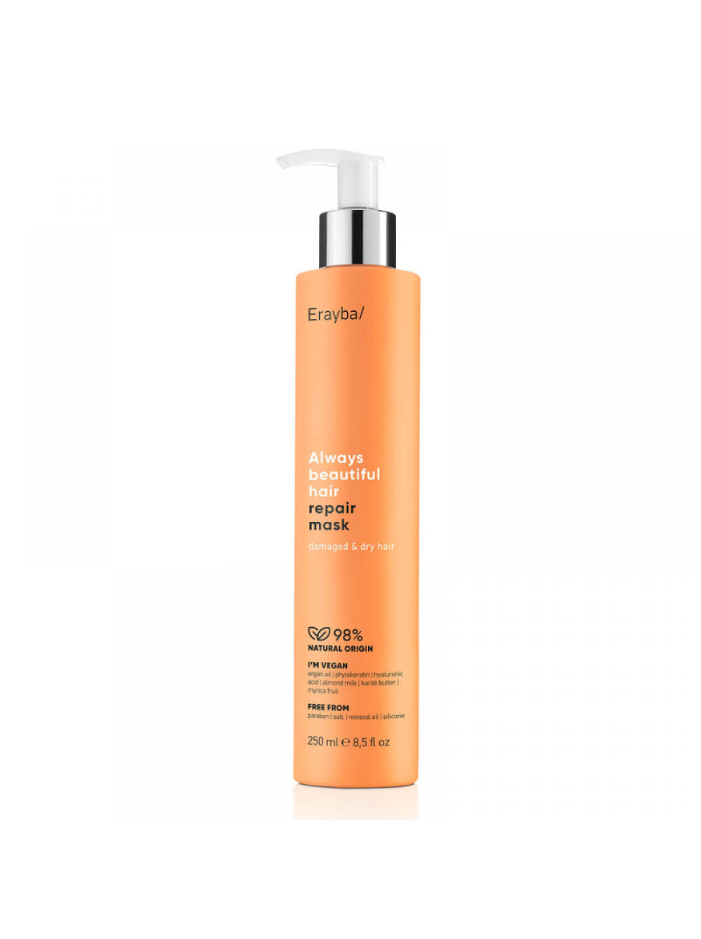 Нанесите маску на вымытые и слегка подсушенные полотенцем волосы. Равномерно распределите по длине, оставьте на 5–10 минут, затем тщательно смойте водой. Для максимального эффекта используйте после шампуня Erayba ABH Repair Shampoo.