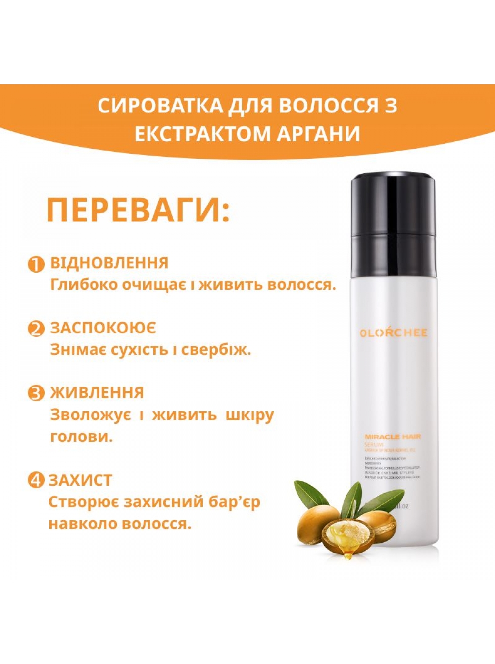 Спрей-сироватка Olorchee Miracle Hair Serum з олією аргани розроблена для інтенсивного розгладження, живлення та захисту волосся. Легка формула поєднує функції догляду і стайлінгу: вона допомагає приборкати пухнастість, надає блиску і робить волосся більш гладким і слухняним. Засіб не обтяжує, миттєво пом'якшує та покращує зовнішній вигляд пасм.