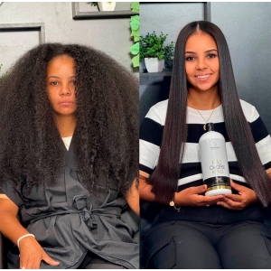 Кератин вирівнює кутикулу волосся, завдяки чому волосся стає гладким та блискучим. Це особливо помітно на сухому або пошкодженому волоссі, яке раніше виглядало тьмяним. -