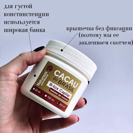 З ботоксом ситуація інакша. Багато склади для процедури ботокса, наприклад Natureza B-tox Cacau do Brasil, мають густу консистенцію, для такої консистенції ми використовуємо широку банку. Тому набір для ботокса волосся буде зручний у використанні.